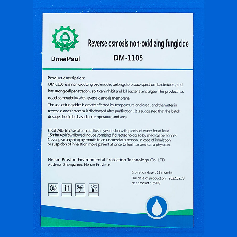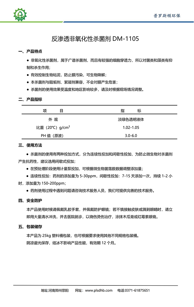 普罗斯顿环保 反渗透非氧化性杀菌剂DM-1105 一、产品特点 ·非氧化性杀菌剂,属于广谱杀菌剂,而且有较强的细胞穿透力,所以对菌类和藻类有抑 制和杀生作用; ·有效控制生物粘泥,防止膜污染,可生物降解; ·本杀菌剂与阻垢剂、絮凝剂兼容,不会对膜产生危害; ·杀菌剂的使用效果受温度和地区影响较多,请及时根据现场情况调整。