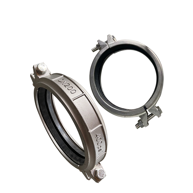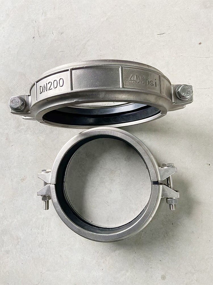 8寸304不锈钢DN200沟槽式抱箍(考贝林哈夫卡)400PSI承压产品介绍说明‌ ‌产品定义与结构特征‌ ‌产品名称‌:304不锈钢沟槽式抱箍(行业俗称“考贝林”、“哈夫卡箍”),为半剖式可拆卸管道连接件,专为带沟槽的钢管设计。 ‌材质标准‌:主体采用‌SUS304不锈钢‌(ASTM A240/A276),符合食品级与工业耐腐蚀要求,内表面光洁度Ra≤0.8μm,抗氯离子腐蚀,适用于长期接触水、弱酸碱介质。 ‌尺寸规格‌:‌DN200‌(公称直径200mm),对应英制‌8英寸‌,适配标准沟槽管件(如GB/T 19712、ANSI/ASME B16.5)。 ‌
